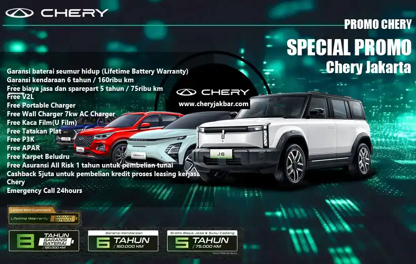 Promo harga dan penawaran angsuran khusus untuk si tangguh Tiggo 8 CSH, Tiggo 9 CSH, Tiggo Cross Premium, Tiggo Cross Comfort, Chery J6, Omoda E5, Omoda C5, Tiggo 8.